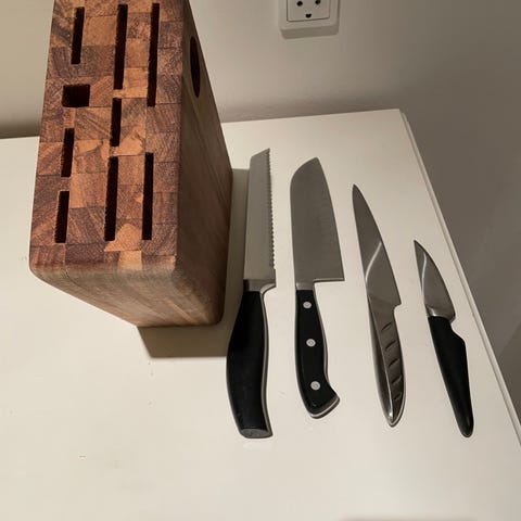 Rosendahl knivsæt bestående af 4 knive med forskellige størrelser og blade i rustfrit stål. Knivene har sorte håndtag og er velegnede til forskellige køkkenopgaver som skæring og hakning. Den ene knivs skær er deformt , men følger med gratis.