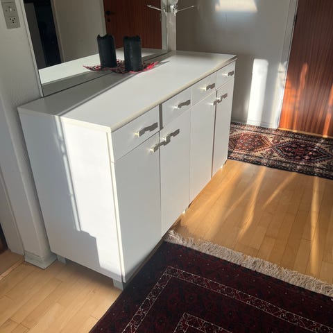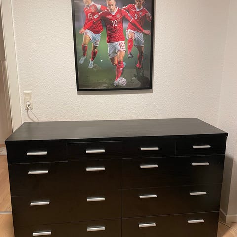 Solid kommode i mørkt træ med to skabe, fire små skuffer og åbne hylder i midten. I pæn, brugt stand med lette brugsspor. Perfekt til stue, entre eller som TV-møbel.