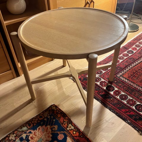 Hans J Wegner rundt bakkebord fremstillet i massiv Eg. Bordet har aftagelig bordplade, og et understel med krydsforbindelser for stabilitet.