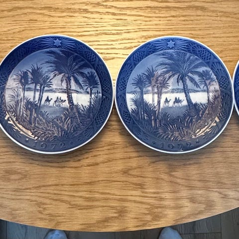 6 kopper og 4 tallerkener og et par ekstra tallerkener med andre stempler.. Der er et minimalt hak i den ene kop. Se billede.
