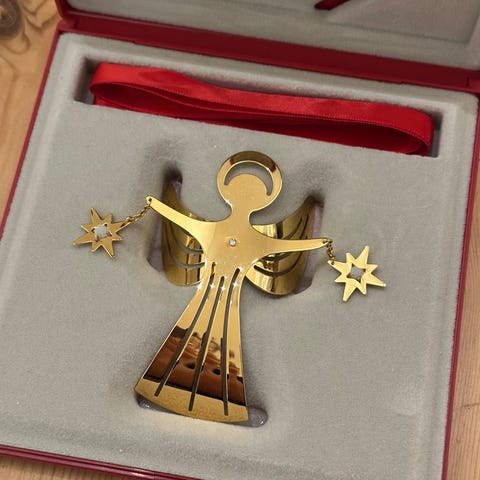 Royal Copenhagen Georg Jensen Angel-Bright juleophæng fra 1989. Fremstillet i metal med en guldfarvet finish. Juleophænget forestiller en engel med stjerner i hænderne. Leveres i original æske med tilhørende bånd og informationskort. Designet til juleudsmykning.