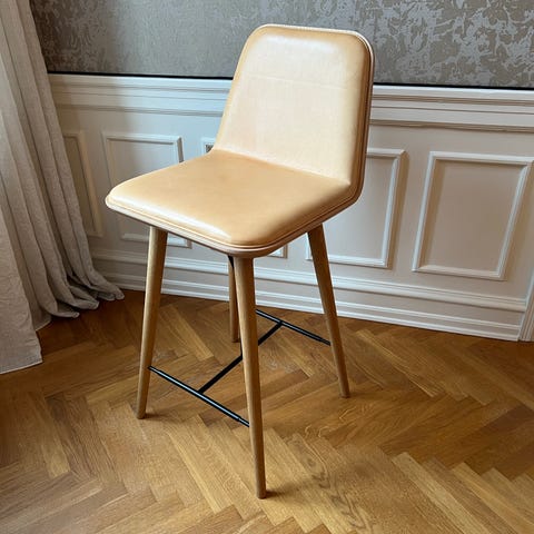 1 stk. Spine Barstol fra Space Copenhagen i eg, med sæde i kernelæder. Samme stol som i Ruby bar. W45 X D51,5 X H98 X SH69,5 CM. Sæde har spor/patina af brug, men gør kun stolen smukkere og smukkere. Enkelte mindre brugs mærker i træ stel som forventeligt efter brug. Se billeder - ingen brugsspor er forsøgt fjernet.