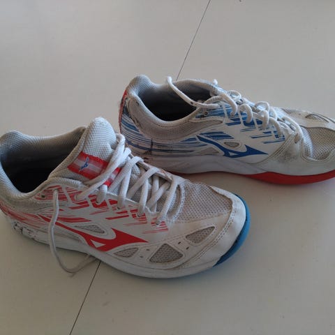 Mizuno i størrelse 41. Skoene er blå med hvide og røde detaljer. Designet til sport og løb med fokus på komfort og funktionalitet. Brugt indedørs til håndbold men for smap - navn save Lightning z6