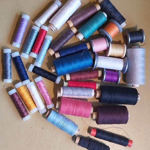 Samling små ruller med sytråd, forskellige farver og tykkelser