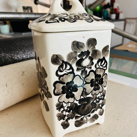 Fin lille tysk keramik krukke i brune nuancer.