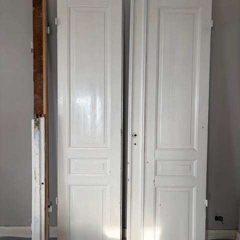 Dobbelt fyldningsdør med karm u. bundstykke eftersom det er tængt imellem to høje stuer. Det har stået i en lejlighed på Vesterbro og formodes at være fra ca. 1904.