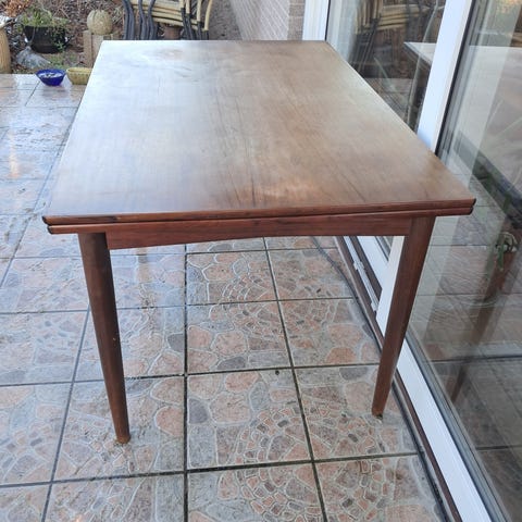 Bord med hollandsk udtræk udført i palisander. Dansk design 1960’erne. Højde 73,5 cm, bredde 85 cm og længde fuldt udfoldet 236 cm. Fremstår med alm. brugsspor. Pris 2.500,- kroner.