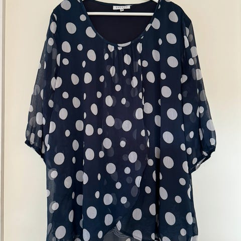 Kortærmet blå/turkis tunika sweater. Lukkes med 3 store, stofbetrukne knapper. Kraven er kantet med kaninpels og pyntet med 14 sorte knapper.
