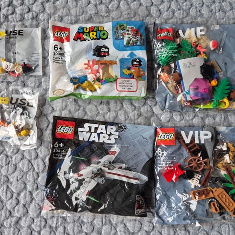 En fra Lego world, de 6 røde klodser, en pose med grønt og en veteranbil.