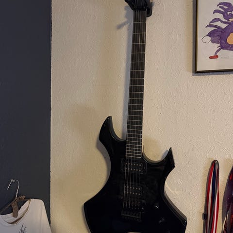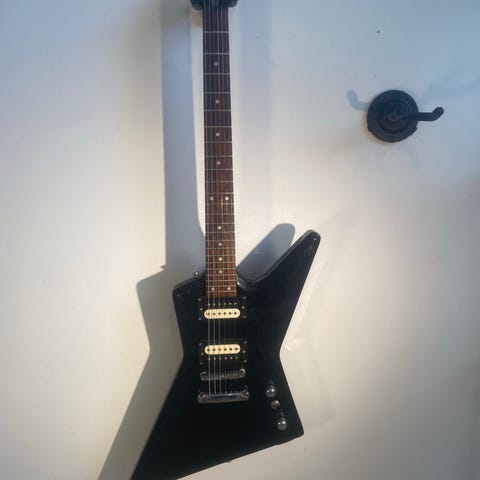 Elektrisk guitar i sort farve med hvidt pickguard og tremoloarm. Har 3 enkeltcoil-pickupper og en rosewood gribebræt. Velegnet til forskellige musikgenrer og øvelser.
