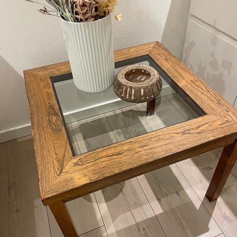 Et super fedt sofabord med glasplade og magasin holder under pladen
