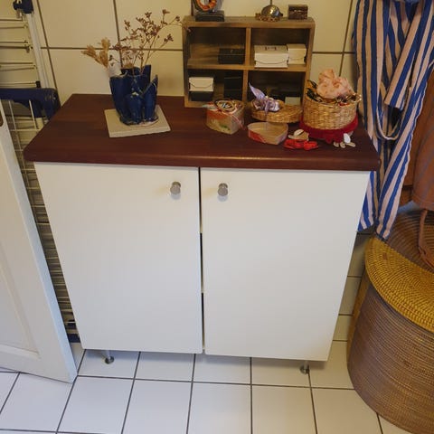 4 skabe med en hylde i hver samt bordplade i hvid glans.