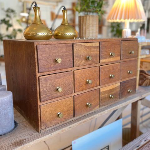 Retro kommode / skuffedarium, oprindeligt arkivskab til kartotekskort, fremstår sortmalet med patina hist og pist og med messinggreb, mål: B: 50 x D: 42 x H: 56 cm