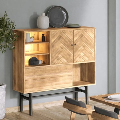 Nederst er der to store skuffer, som begge er med push open og bund beklædt i sort filt. Foruden låger og skuffer har highboardet flere åbne rum. Her er det muligt at tilkøbe lys, for et mere stilfuldt og iøjenfaldende udtryk.