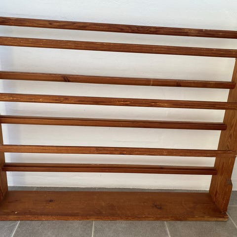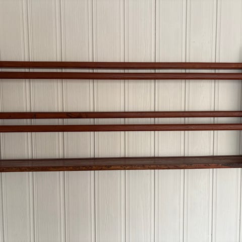 Tallerkenrækker/hylder, Gamle retrohylder, som også kan bruges til tallerkenrækker………de to store er lidt vakkelvorne, men kan helt sikkert justeres med skruer eller lign.
