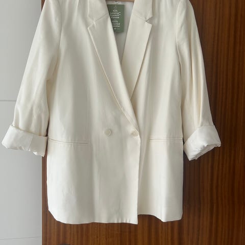 H&M Grå Dame Blazer og Skjorte i størrelse XS. Blazeren har lange ærmer med rynkede detaljer og to forlommer. Skjorten har knaplukning foran og brystlommer. Materialet er ikke specificeret, og farven er grå. Passer til kvinder og kan anvendes til formelle eller afslappede lejligheder.