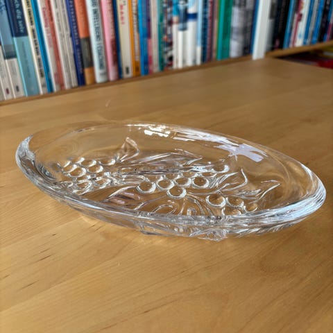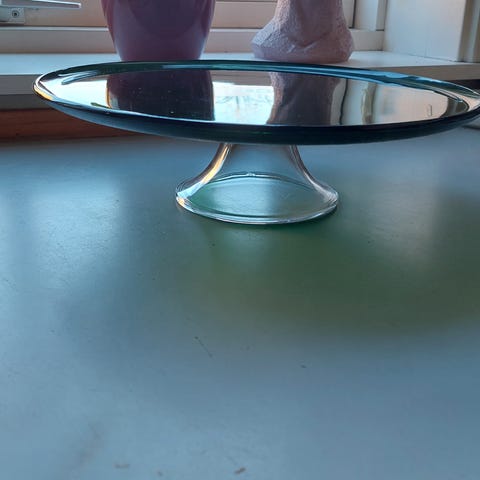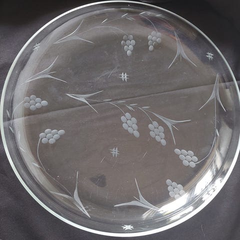 Polsk glasfad dekoreret med frugter 💚 Smukke buer på kanten. Med små luftbobler og ridser efter brug, men ingen skår.