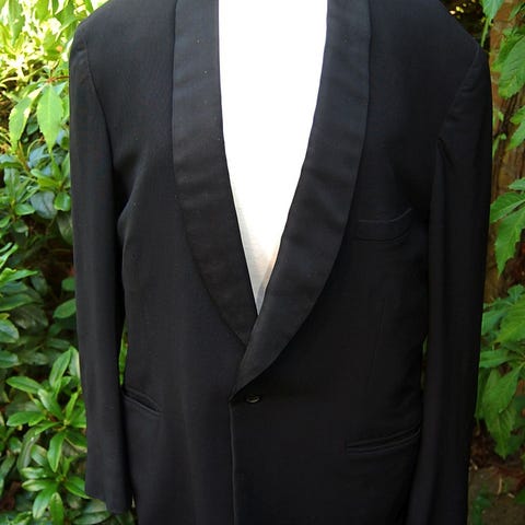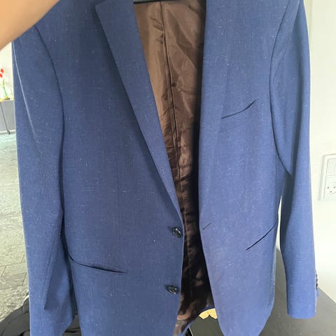 Flot jakke i blå med sort revers og sorte bukser. i et kraftig lærreds produkt. Er helt ubrugt. Jakkens mål erRygbredde taget 20 cm ned fra halsen 47 cm og ærmelængde 66 cm. Buksen er 96-110 cm i liv og 115 cm i benlængde.
