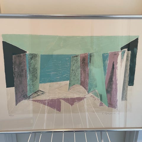 Tryk/litografi af Emil Gregersen, hvor han efterfølgende har farvet med kridt.