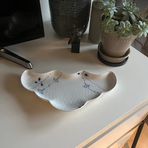 Royal Copenhagen Blue Fluted Mega serveringsfad i porcelæn med klassisk blå blomsterdekoration. Fadet har en rektangulær form med bølget kant og er velegnet til servering af mad ved bordet.