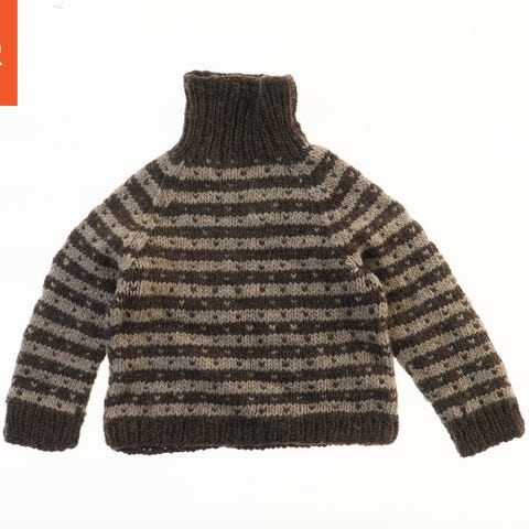 En langærmet strikket sweater med et geometrisk mønster i blå og beige farver. Den har ribkant omkring halsen og forneden. Sweateren har to knapper ved halsudskæringen.