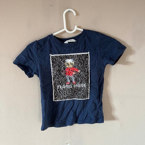 Denne t-shirt har korte ærmer og er dekoreret med sorte pailletter, som giver den et skinnende udseende. Både forsiden og bagsiden er fyldt med pailletter, hvilket skaber et sammenhængende design. Ved halsen er der en lille åbning med en knaplukning på bagsiden. Det er en stilet og dekorativ tøjgenstand, ideel til festlige lejligheder.