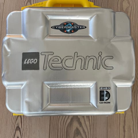LEGO Technic CyberMaster Computer Controlled Model i en bærbar taske med gul håndtag. Sættet indeholder forskellige tekniske dele og en CD med software til at programmere og styre modellen. Velegnet til teknisk interesserede brugere, der ønsker at bygge og programmere avancerede LEGO modeller.
