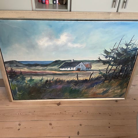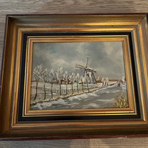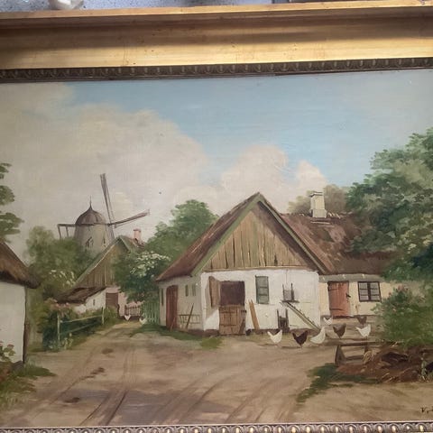 Maleri Landskab med Vindmølle og Hus i Ramme