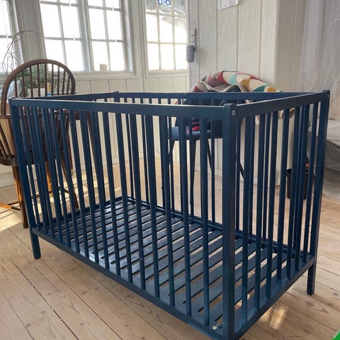 Gammeldags tremmeseng med madras. Siden kan slås ned. 100 * 150 indvendigt mål