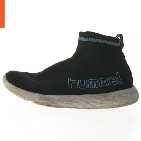 Et par Hummel sko til børn i størrelse 31. Skoene er primært i blå og lilla med hvide detaljer på siden. Overdelen er lavet af mesh for bedre ventilation, og de har en velcro lukning for nem brug. Ydersålen er lysegrå og viser nogle tegn på brug.