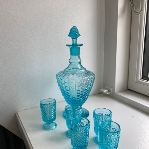 Karaffel turkis glas med tre små glas - antik.