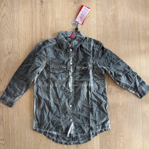 Skjorten lukkes med hvide knapper.