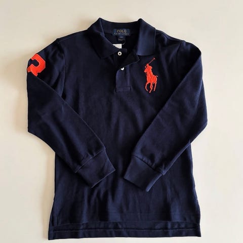Polo Ralph Lauren langærmet polo shirt i blå farve, størrelse 7 til dreng. Fremstillet i blødt materiale med klassisk krave og knaplukning. Velegnet til hverdagsbrug og som en del af børns garderobe.