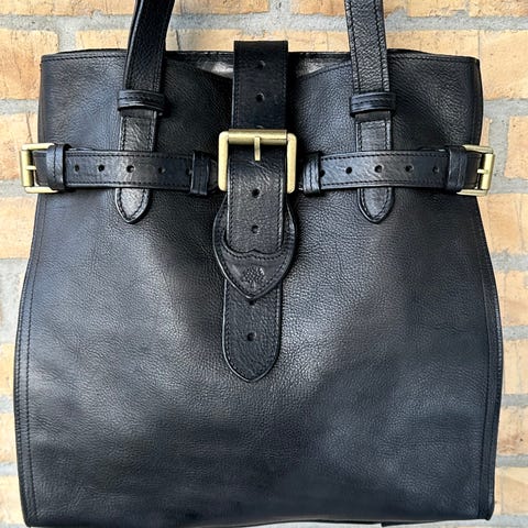 Elgin er designet som en rummelig tote med to skulderstropper, bælte-detaljer hele vejen rundt og det klassiske Mulberry-tree præget i læderet. Indvendigt finder du ét stort rum samt lynlåslomme, og tasken er foret med råt skind, hvilket understreger den solide vintage-kvalitet.