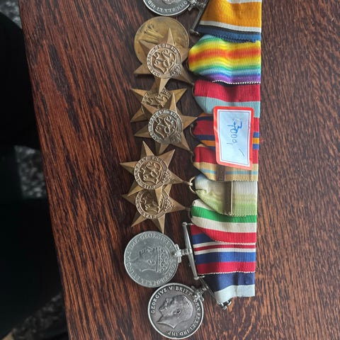 Sæt bestående af 5 britiske militærmedaljer fra Anden Verdenskrig. Medaljerne inkluderer to stjerneformede medaljer og tre runde medaljer, alle monteret på en farverig båndstang. Medaljerne er lavet af metal og viser forskellige militære hædersbevisninger. Velegnet til samlere eller historisk interesse.