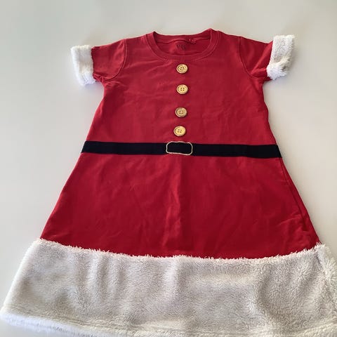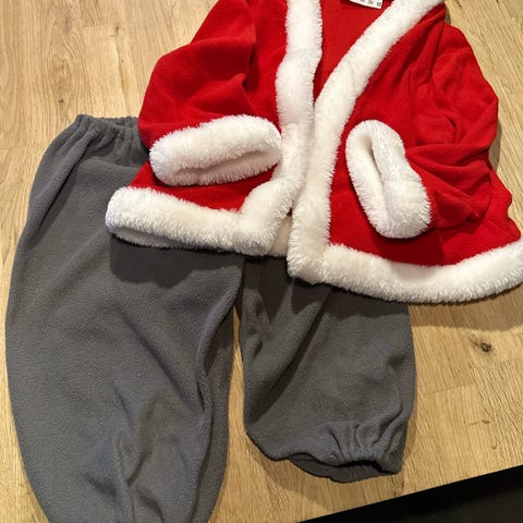 H&M Nissekostume i rød farve til børn i størrelse 104. Kostumet består af en overdel med hvid kant og sort bælte samt matchende bukser.