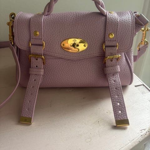 Den ikoniske Roxanne i micro-version – et sjældent syn blandt nyere Mulberry-modeller. Tasken kombinerer den klassiske, bælteinspirerede front med et moderne twist i form af kontrastforing i lyseblåt skind.