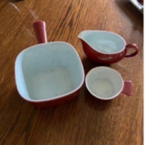 lågskål med hank 24cm incl hank, 15x15cm, h 8½cm u/låg 100kr.,