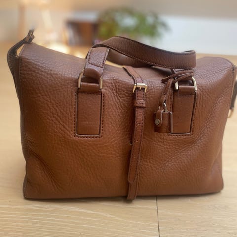 Tasken fremstår yderst velholdt med meget lette brugsspor. Indvendigt pæn og ren med få lette mærker i foret fra kuglepen. Hardware står skinnende med kun let patina.