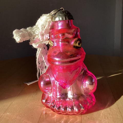 2 lyserøde frøer juletræs pynt fra Lisbeth Dahl. En stadig med mærkat. Lidt farve nuancer. Mål: se venligst fotos.