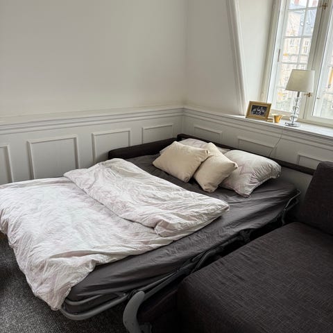 Softline, grå med aluminiums stel. Kan bruges som sofa og seng. Man kan flytte den øverste madras ned ved siden af den nederste så det bliver en dobbelt seng. Ideel til gæsteværelset. Sælges uden de viste puder... de er kun med som illustration