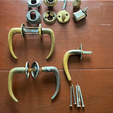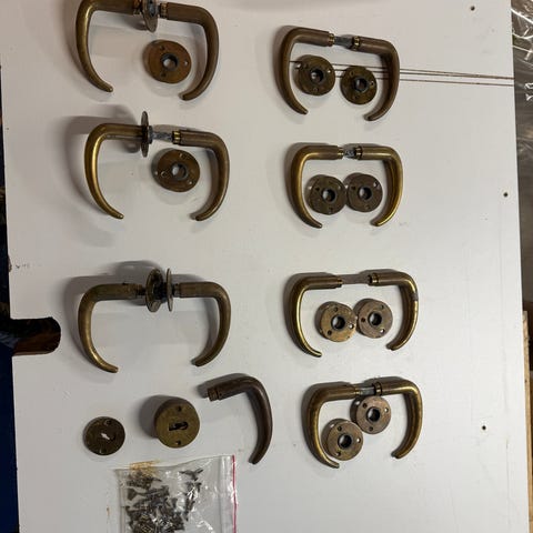 Flere forskelle gamle originale sæt dørhåndtag i messing, coupe greb/kay fisker. De sælges som udgangspunkt som sæt, værende et alm sæt eller et sæt med langskilt. 450 for et alm sæt, eller 900 for sæt med langskilt.