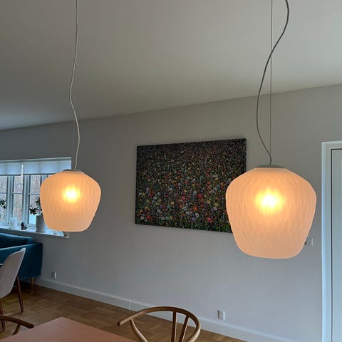Smuk pendellampe, modellen hedder blown pendant, og er i mundblæst opal glas.