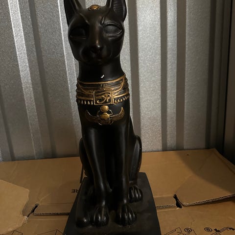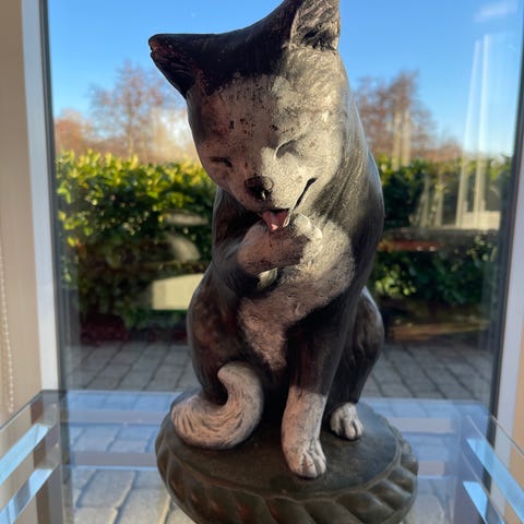 Dekorativ keramik kat med sort/hvide striber. Katten består af to dele.