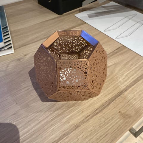 Tom Dixon olielampe med glas og metal. Lampen har en hvid keramisk base og en brun glaslygte. Den medfølgende metalholder er perforeret med et geometrisk mønster og er sort i farven. Olielampen er velegnet til dekorativ belysning.