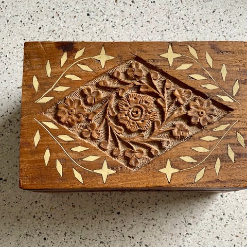 Træskrin med gl. look, alder ? Spejl kan vippes ned