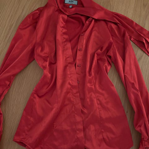 Aldrig brugt . Aldrig vasket farven.hvid og blå. Den er 97 % bomuld. 3% stræk. Længe målt fra nakken og ned, under kraven, ca 63 cm. Brystmål 2x 46. Men der er stræk i. Så den kan give dig mere