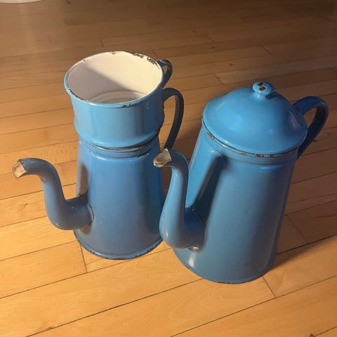 Jeg har denne pæne kaffekande med tragt og filter poser og en lille pande, kanden har en lille skade, men den er ikke utæt. Pris 300kr.
