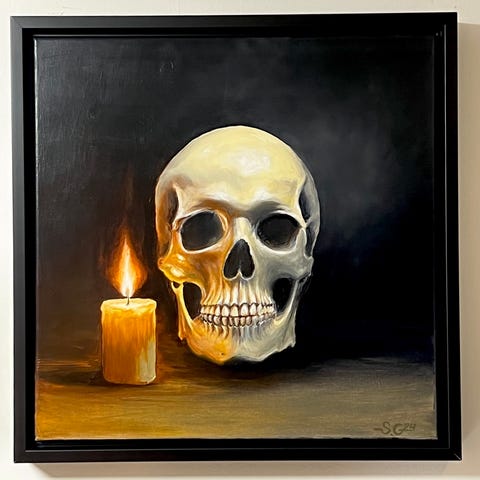 Maleri med motiv af en kranium og brændende stearinlys, original, Memento Mori