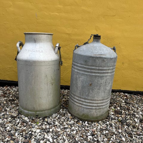Sæt bestående af 3 uidentificerede mælkespande fremstillet i metal. Spandene har forskellige størrelser og traditionelle håndtag til nem transport. Egnet til opbevaring eller transport af væsker, primært mælk. Passer til brug i landbrug eller til dekorative formål.